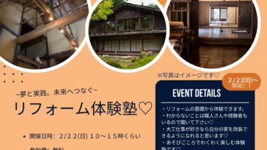 リフォーム体験塾 2026年2月22日(日)第一回古民家リフォーム体験塾開催します!! ●場所:岡山県美作市今岡(大原IC・宮本武蔵駅すぐ)●日時:2/22(日) 10時~15時くらいまで●参加費:無料●持ち物:飲み物、おやつ、軍手、手ぬぐい、動きやすく暖かい服装、ノコギリ、カナヅチ、持... 2026.01.05 リフォーム体験塾